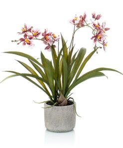 Oncidio color burdeos, con base frondosa de hojas verdes y jardinera de cerámica. Altura 45cm (MINI). 4 uidades