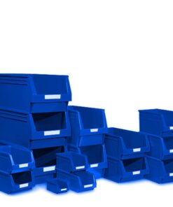 Caja plástico apilable con abertura frontal.