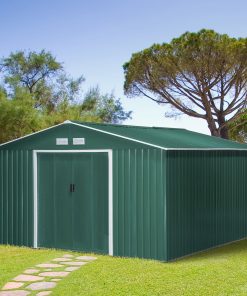 Outsunny Caseta de Jardín Exterior 12,4 m² 340x386x200 cm Cobertizo de Jardín Exterior con Puerta Corredera Techo Inclinado Base Refuerzo (Suelo NO Incluido) y 4 Ventanas Verde