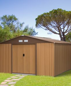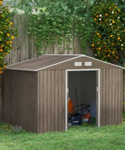 Outsunny Caseta de Jardín Exterior 12,4 m² 340x386x200 cm Cobertizo de Jardín Exterior con Puerta Corredera Techo Inclinado Base Refuerzo (Suelo NO Incluido) y 4 Ventanas Marrón