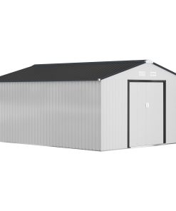 Outsunny Caseta de Jardín Exterior 12,4 m² 340x386x200 cm Cobertizo de Jardín Exterior con Puerta Corredera Techo Inclinado Base Refuerzo (Suelo NO Incluido) y 4 Ventanas Gris Claro