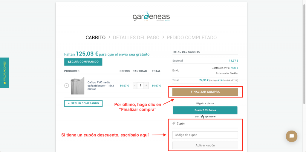 ¿No tienes muy claro cómo se aplica un cupón de descuento? Para ello sólo tienes que introducirlo en el proceso de compra en el espacio indicado para ello y darle al botón “Aplicar cupón”. Así de fácil. Si quieres información más detallada al respecto, dirígete al final de la página, donde encontrarás imágenes explicativas que resumen todo el proceso de compra e indican cómo se utilizan los cupones descuento.