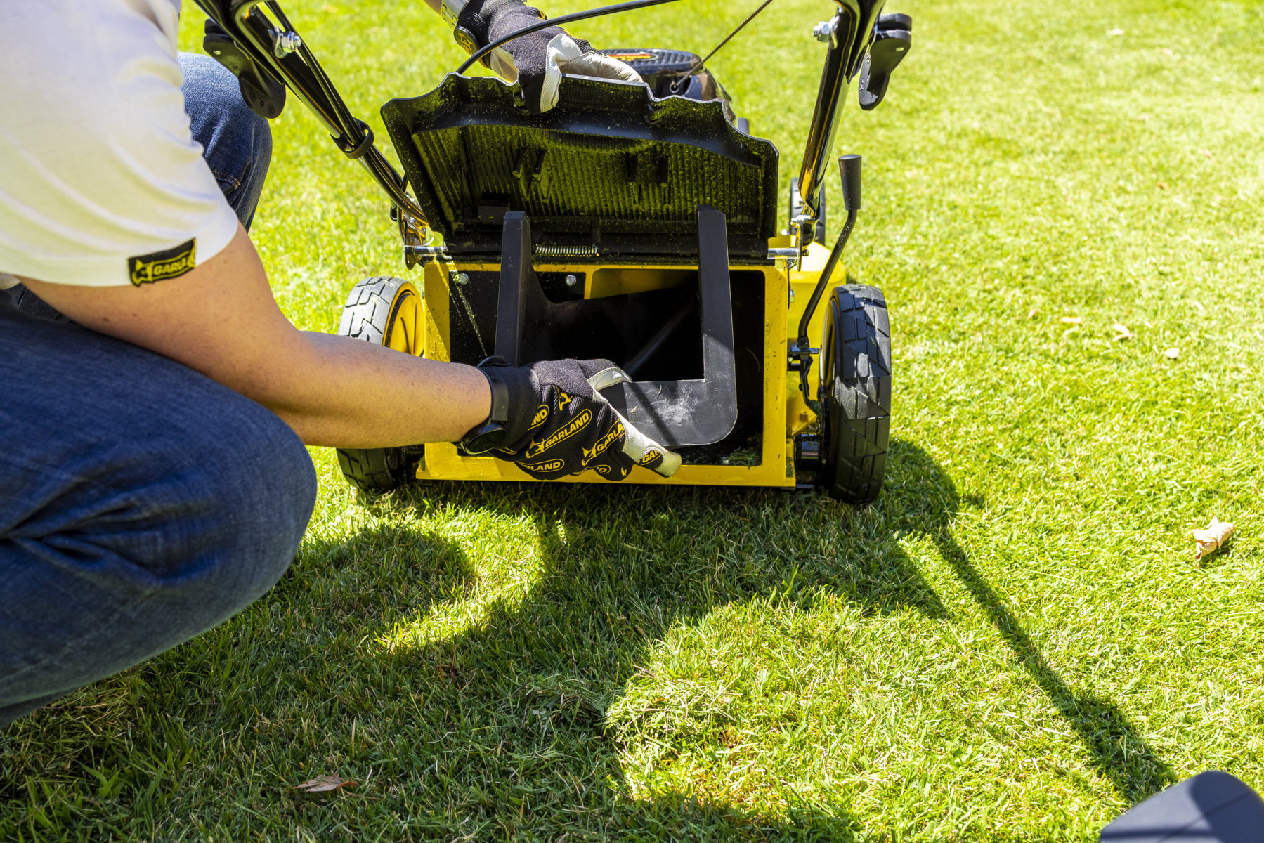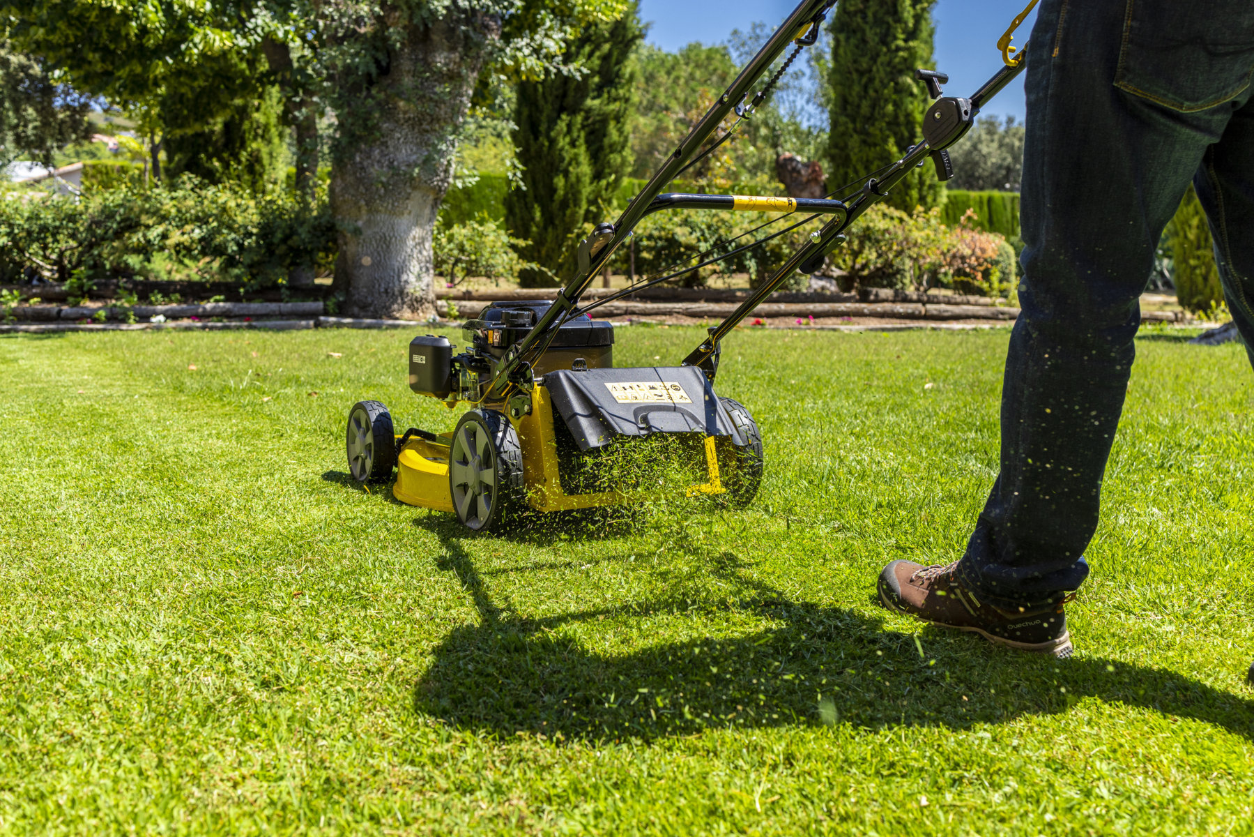 Regulación de altura de las 4 ruedas en una solo palanca, con 7 alturas de corte distintas (15-75 mm), se adapta completamente al acabado que quieras dar a tu pradera.