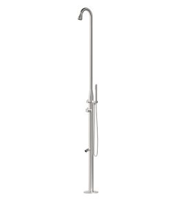 Puede integrarla fácilmente en el cuarto de baño de su hogar o convertirla en un elemento distintivo de su jardín, gracias a su elegante diseño y a sus avanzadas funciones. Entre ellas, la gran alcachofa de ducha con luz LED, que añade un toque de elegancia a su rutina de bienestar, acompañada de un cómodo lavapiés, que ahora permite el uso de agua caliente mezclada para un confort aún mayor.