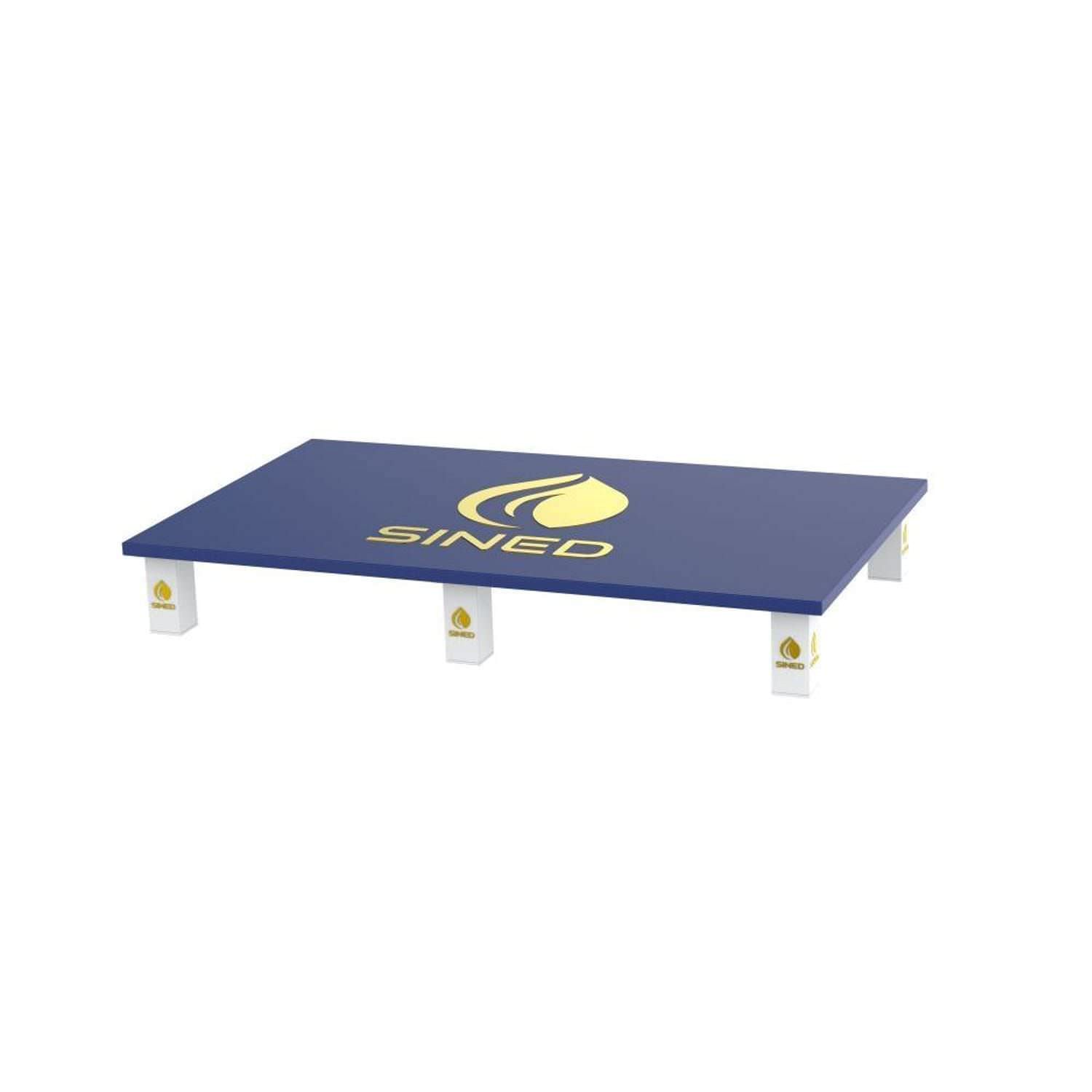 Expositor de ducha azul Sined. Soporte de ducha azul de acero de 100 x 60 cm. Equipado con 6 pies para garantizar la estabilidad. Ideal para 3 duchas grandes o 2 duchas grandes y 3 fuentes.