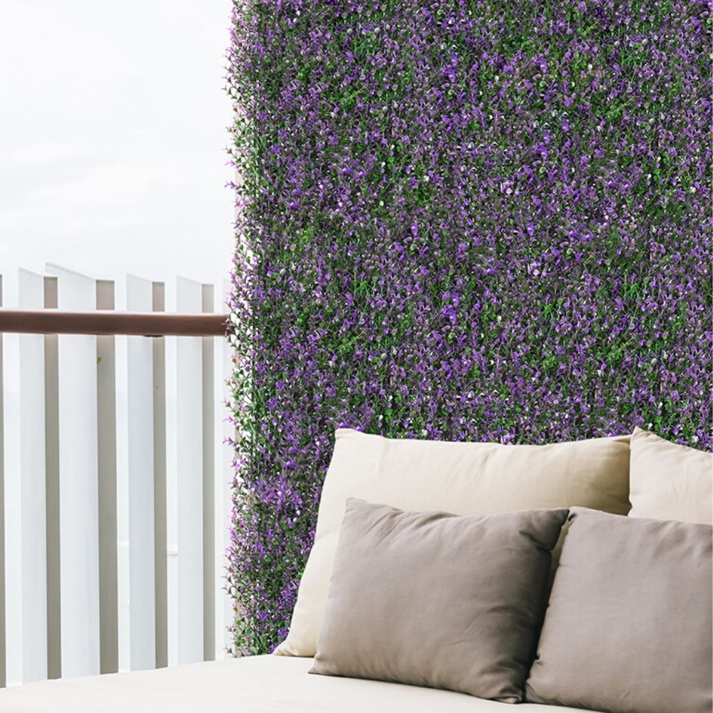 Jardín vertical Lavanda decorativo. Ideal para decorar un espacio, pared o techo. Fabricados con hojas sintéticas con magníficos colores y flores originales que les otorgan una excepcional apariencia y acabado natural. Su base está conformada por paneles de PVC y anclajes que se unen entre sí para crear piezas más grandes. Precio por unidad