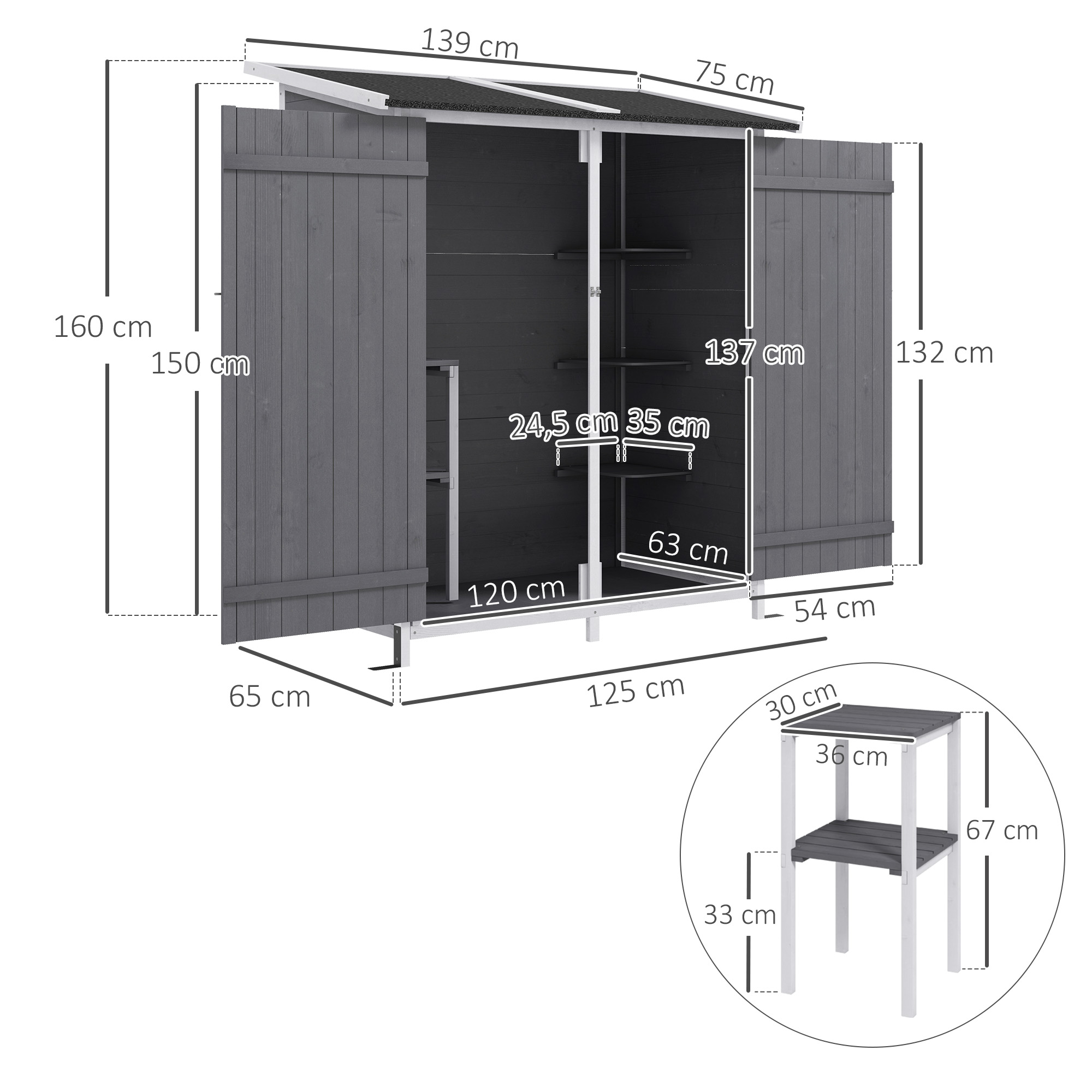 Outsunny Caseta de Jardín de Madera 139x75x160 cm Armario de Jardín Cobertizo para Almacenaje de Herramientas con Estantería Movible Puertas con Cerrojo Techo Asfáltico Gris