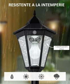 Añade un toque de luz y diseño distintivo a tu jardín con esta farola solar vintage de Outsunny. Se enciende automáticamente al anochecer, y su impermeabilidad garantiza durabilidad al aire libre. Los 19 LEDs regulables emiten una luz blanca y cálida bajo un difusor transparente. Esta luz solar de jardín ilumina y embellece tu jardín con estilo y comodidad. Características: Lámpara exterior de estilo vintage, perfecta para el jardín, patio o terraza Encendido automático al anochecer y apagado al amanecer, con ajuste de brillo Carga a través de paneles solares, ayudando a ahorrar energía Una carga completa dura 6-8 horas y permite 6-8 horas de funcionamiento (luz continua) o 2-3 días PIR (detección de movimiento) Estructura resistente a las condiciones meteorológicas (clase IP44), adecuada para uso continuo al aire libre Esta farola de jardín está equipado con interruptor de encendido/apagado y modo automático Poste de aluminio pintado con tornillos incluidos para asegurar una instalación segura en el suelo La bombilla es decorativa y no tiene función de iluminación, pero los LEDs alrededor sí iluminan Esta luz solar exterior de jardín requiere montaje Especificaciones: Color: negro Material: aluminio y vidrio templado Medidas totales: Ø22×194 cm (DxAL) Color del LED: 3000K Grado de impermeabilidad: IP44 Tiempo de funcionamiento: 6-8 horas (completamente cargado) Tiempo de carga total: 6-8 horas Luminosidad: 10-260 LM (PIR), 130 LM (luz continua) Cumple con la normativa: CE (EMC, ROHS) Referencia: B30-016 Nota: Lámpara decorativa sin función de iluminación El paquete incluye: ● 1 x Lámpara solar de jardín; ● 1 x Batería de litio 3,7V/2200mAh; ● 1 x Manual de instrucciones