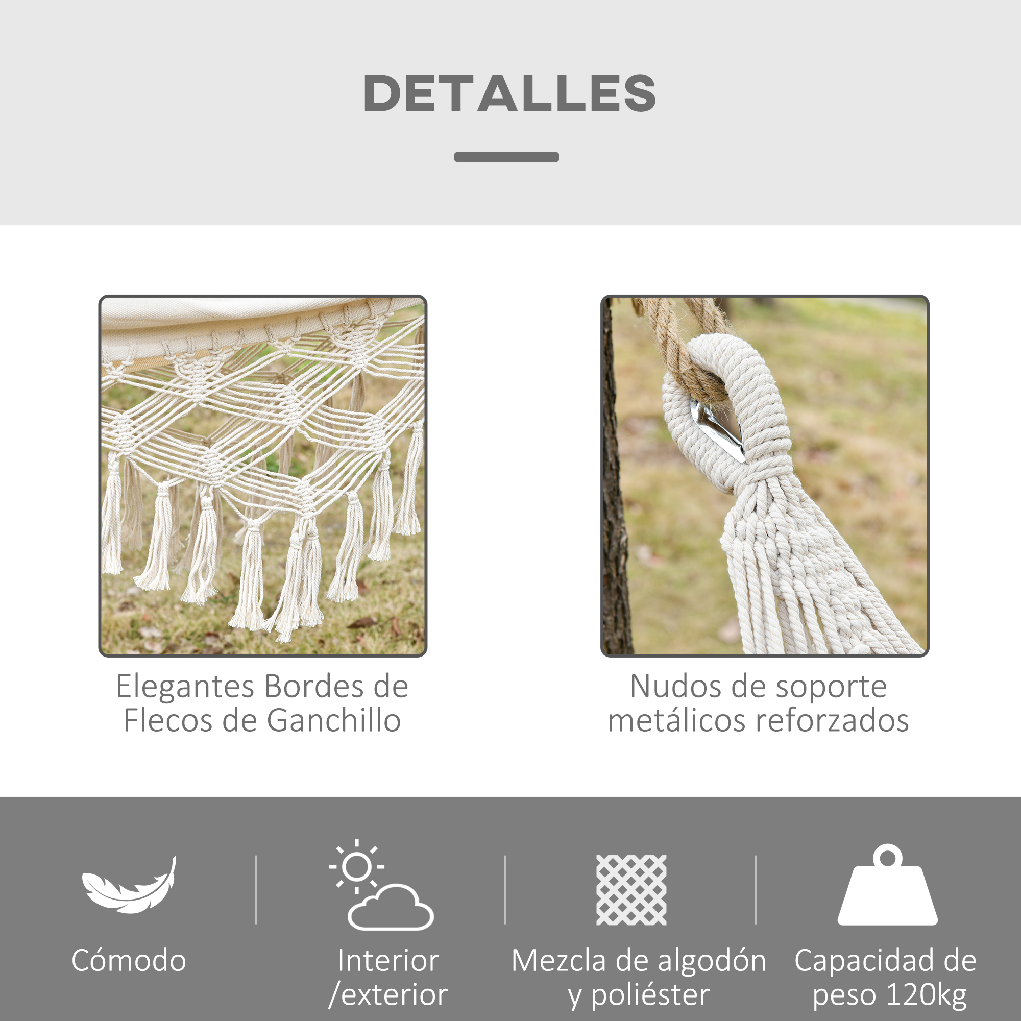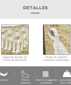 ¿Has visto esta hamaca de estilo bohemio de Outsunny? Ideal para disfrutar de una tarde tomando el sol o relajarte con un buen libro a la sombra de los árboles o en un soporte para hamacas (no incluido). Confeccionada en tela de algodón y poliéster con fuertes nudos de cuerda a cada lado y anillas de metal, soporta hasta 120 kg. E incluye una bolsa para que puedas llevártela a cualquier parte. Características: Hamaca de camping de lona transpirable muy cómoda de tejido mixto de algodón y poliéster Hamaca de color crema de estilo bohemio con originales y elegantes borlas decorativas a modo de flecos Adecuada para su uso tanto en casa (jardín, piscina, terraza) como en exteriores (camping, playa, lago, etc.) La medida de la tela de 200×150 cm es adecuado para 1 persona (carga máxima recomendada: 120 Kg) Con cuerdas con presillas de sujeción y refuerzo metálico en los extremos para una fácil fijación al soporte de tu elección Incluye bolsa para facilitar su almacenaje y transporte Especificaciones: Color: crema Material: tejido mixto (65% algodón, 35% poliéster), cuerda de algodón Medidas totales: 288×150 cm (LxAN) Medidas de la tela: 200×150 cm (LxAN) Largo de los flecos: 35 cm Medidas de la bolsa: 40×35 cm (LxAN) Carga máxima: 120 kg Referencia: 84A-196CW El paquete incluye: ● 1 x Hamaca colgante