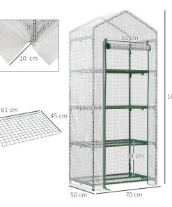 ¿Buscas un invernadero compacto para poner en tu jardín o patio? Entonces este de Outsunny puede ser tu elección ideal. Tiene 4 estantes para que puedas tener tu jardín vertical con macetas con tus plantas y cultivos resguardados de la intemperie. El techo de PE transparente permite que tus plantas obtengan la luz del sol indispensable para ellas, y tú y tus invitados podréis ver las flores desde afuera. Posiblemente, no encuentres otro invernadero tan práctico y funcional como este. Características: Tamaño compacto, ideal para usar en múltiples ubicaciones 4 estantes para tener suficiente espacio para todo tipo de plantas Cubierta de PE transparente para que tus plantas disfruten del sol Estructura tubular de acero resistente con pintura en polvo electrostática Puerta plegable con cremallera para facilitar el acceso Incluye todos los accesorios necesarios para su instalación Requiere montaje Especificaciones: Color: blanco Material: acero y PE Medidas totales: 70x50x160 cm (LxANxAL) Medidas de la puerta: 51×131 cm (LxAN) Medidas de las baldas: 61×45 cm (LxAN) Distancia entre baldas: 34 cm Carga máxima: 15 kg (cada estante) Nivel de resistencia al viento: 4 Referencia: 845-228V02WT El paquete incluye: ● 1 x Invernadero con estantes; ● 1 x Manual de instrucciones