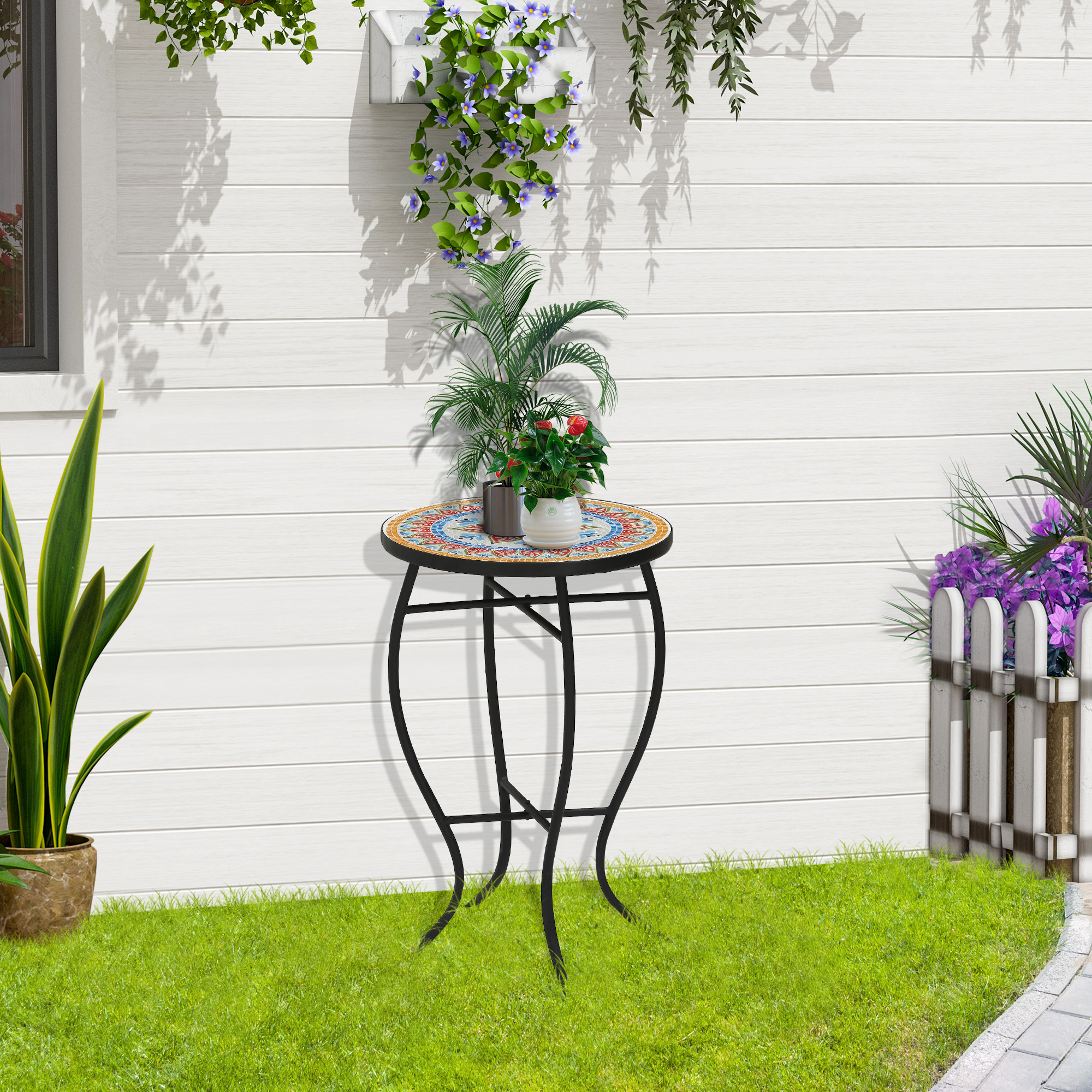 ¿Estás preparando tu terraza o jardín para la llegada del buen tiempo? Entonces esta mesa con mosaico de jardín de Outsunny seguro que te encantará. La mesa cuenta con una bonita estructura metálica con patas curvas y una encimera con un grabado colorido tipo mosaico. Es tan bonita que, aunque esté diseñada para estar a la intemperie, podrás usarla también en el salón, como mesita de noche o en otros espacios interiores de tu casa. Incluso usarla como soporte para tus plantas. Características: Mesa elegante gracias al bonito mosaico y colorido de la encimera y la estructura con patas curvas de metal Ideal para utilizarla como mesa de jardín, mesa auxiliar, soporte para plantas, mea de centro y mucho más Mesa con estructura metálica con recubrimiento en polvo para mayor resistencia a la intemperie y a la corrosión Fácil de limpiar con un paño húmedo Requiere montaje Especificaciones: Color: multicolor Material: metal, mosaico Medidas totales: Ø35,5×53,5 cm (DxAL) Grosor del tablero de la encimera: 1,8 cm Distancia entre las 2 patas: 37 cm Carga máxima: 60 kg Referencia: 84B-889BU El paquete incluye: ● 1 x Mesa de exterior; ● 1 x Manual de instrucciones