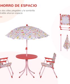 A los pequeños les encanta imitar a los adultos. Y que mejor que teniendo su propio conjunto de jardín. Está compuesto por una mesa, dos sillas plegables y, como no, una sombrilla. Indispensable para proteger a los niños de los rayos del sol en los calurosos días de verano. Hechas con estructura de metal ligera para fácil movimiento. Nota: La silla tiene un bloqueo de hebilla y los niños deben usarla bajo la supervisión de sus padres para la seguridad Características: Conjunto compuesto por dos sillas, una mesa y una sombrilla Con estructura tubular de metal resistente Sombrilla de 6 varillas imprescindible en un conjunto infantil de exterior para proteger a los niños del sol Perfecto para patios, jardines, balcones, terrazas y otros espacios al aire libre Tejido de la sombrilla y de las sillas estampado para llamar la atención de los peques La ligereza del conjunto facilita su uso entre los más pequeños Las 2 sillas del conjunto son plegables para facilitar su almacenaje y transporte Apto para niños a partir de 3 años Se requiere montaje Nota: La silla tiene un bloqueo de hebilla y los niños deben usarla bajo la supervisión de sus padres para la seguridad Especificaciones: Color: rojo Material: metal, poliéster Medidas de la mesa: Ø50×46 cm (DiámxAL) Medidas de la silla: 39x38x52 cm (LxANxAL) Medidas de la silla plegada: 51x38x6,2 cm (LxANxAL) Medidas de la sombrilla: Ø100×100-125 cm (DiámxAL) Altura del asiento: 28 cm Medidas del respaldo: 29×52 cm (LxAL) Carga máxima: 35 kg (silla) y 20 kg (mesa) Certificaciones: EN71-1-2-3 Referencia: 312-025RD El paquete incluye: ● 1 x Mesa; ● 2 x Sillas; ● 1 x Sombrilla; ● 1 x Manual de instrucciones