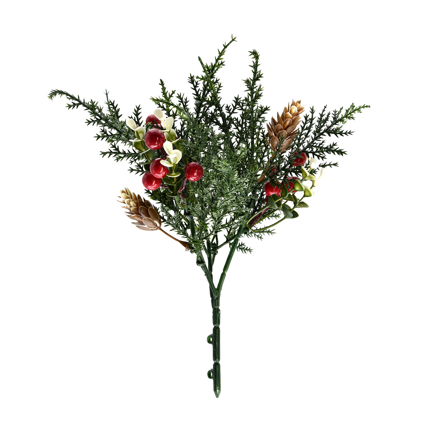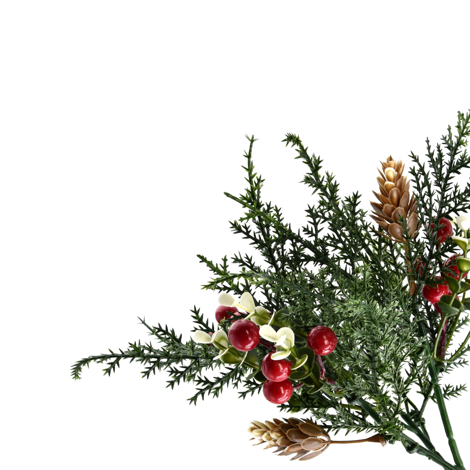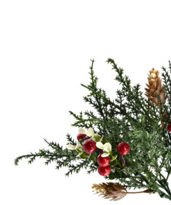 - Detalle: Hojas verdes de abeto con piñas y bayas rojas.