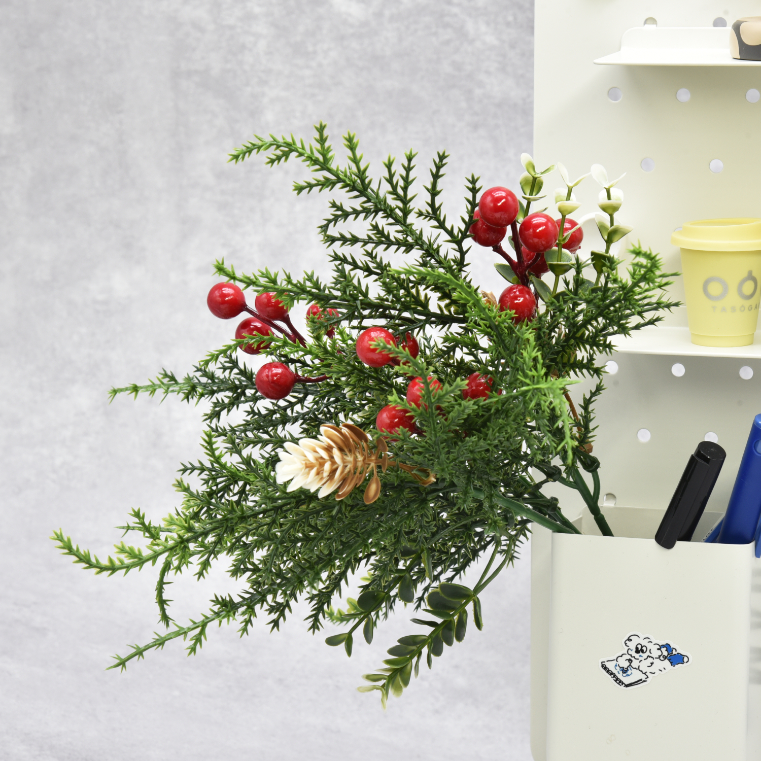 El modelo Deseo Navideño encapsula el espíritu de la Navidad al combinar las hojas verdes y exuberantes del abeto con las brillantes bayas rojas y las piñas, añadiendo un toque festivo y acogedor.