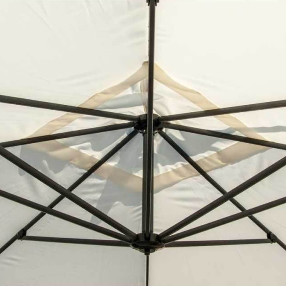 Materiales de calidad: lona de 3 metros de diámetro con la terminación final en plástico y un poste de aluminio inoxidable para asegurar una larga durabilidad, manivela de fácil uso.