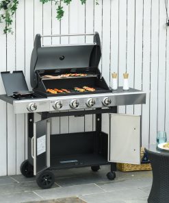 Outsunny Barbacoa de Gas BBQ Gas con 4+1 Quemadores 12 kW Barbacoa Portátil con Termómetro Mesa Lateral Estante Especiero Parrilla Recogedor de Grasa 2 Ruedas para Jardín Exterior Camping Negro