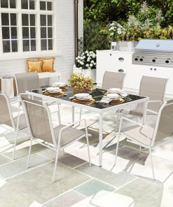 Outsunny Conjunto de Comedor de Exterior Juego de Comedor de Jardín de 7 Piezas con 1 Mesa 6 Sillas Apilables y Marco de Acero para Terraza Patio Blanco y Gris