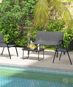 Outsunny Conjunto de Jardín Exterior 4 Piezas Muebles Jardín Exterior con 2 Sillones Apilables 1 Sofá de 2 Plazas y Mesa de Centro con Tablero de Vidrio Templado Negro