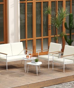 Outsunny Conjunto de Jardín Exterior 5 Piezas Muebles Jardín Exterior con 2 Sillones 1 Sofá de 2 Plazas y 2 Mesas de Centro Diseño de Lamas Impermeable Anti-UV Blanco