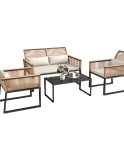 Outsunny Conjunto de Jardín Exterior de Ratán Sintético de 4 Piezas Muebles de Jardín Exterior con Sofá de 2 Plazas 2 Sillones 1 Mesa de Centro de Metal con Cojines Crema y Natural