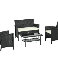 Outsunny Conjunto de Jardín de Ratán Sintético Juego de 4 Piezas Muebles de Jardín con 2 Sillones 1 Sofá de 2 Plazas 1 Mesa de Centro con Tablero de Vidrio y Cojines Negro y Crema