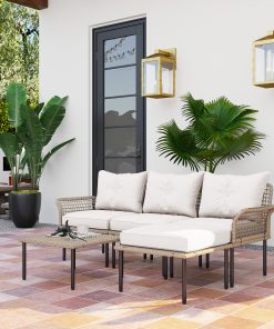 Outsunny Conjunto de Jardín Exterior de Ratán Sintético de 4 Piezas Muebles de Jardín Exterior Sofá Esquinero Incluye 2 Sofás de 2 Plazas 1 Reposapiés 1 Mesa de Centro con Cojines Natural