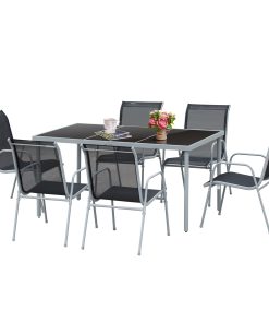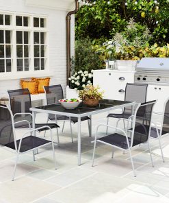 Outsunny Conjunto de Muebles Exterior para Jardín de 7 Piezas Incluye 1 Mesa y 6 Sillas con Resposabrazos Fabricado a Acero Decorativo Estilo Moderno Limpiar Fácil 150x90x72cm Color Negro
