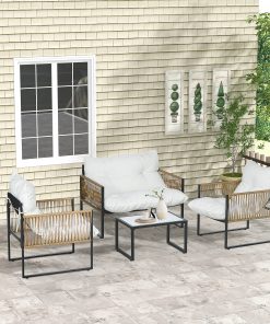 Outsunny Conjunto de Muebles de Ratán para 4 Personas Muebles de Jardín 4 Piezas con Sofá de 2 Plazos 2 Sillones Mesa de Centro y 4 Cojines para Terraza Patio Arena