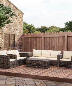 Outsunny Conjunto de Muebles de Ratán 6 Piezas de Jardín Juego de Sofás de 2 Plazas Taburete y Mesa de Comedor con Cojines Acolchados Patio Terraza Balcón Gris y Caqui