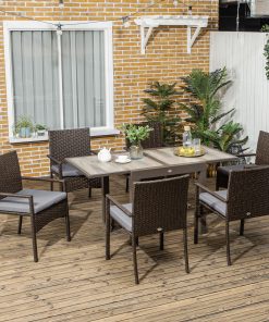Outsunny Conjunto de Muebles de Jardín de Ratán 7 Piezas Juego de Comedor Exterior Incluye 6 Sillas con Cojines y Mesa de Vidrio Templado Marrón