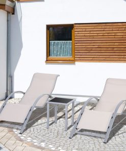 Outsunny Set de 2 Tumbonas Jardín Exterior con Mesa Auxiliar de Vidrio Templado Tumbonas con Respaldo Reposabrazos para Patio Piscina Terraza Exterior Beige