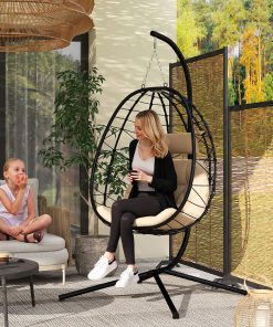 Outsunny Silla Colgante Huevo con Soporte Columpio de Jardín Exterior con Cesta Plegable de Malla Doble Cojín y Portavasos Columpio Colgante para Interior y Exterior Carga 120 kg Arena y Negro