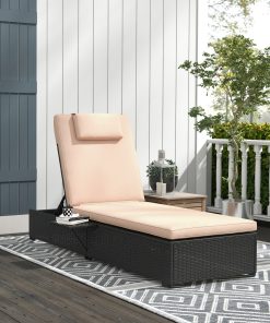 Outsunny Tumbona de Ratán Reclinable Tumbona para Jardín con Respaldo Ajustable en 5 Niveles Mesita y Cojín Carga 120 kg para Patio Terraza Negro y Beige